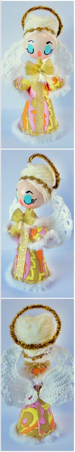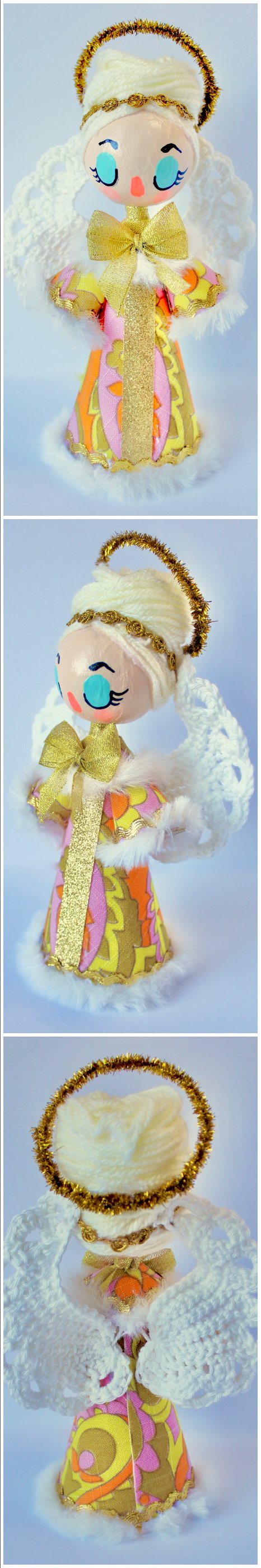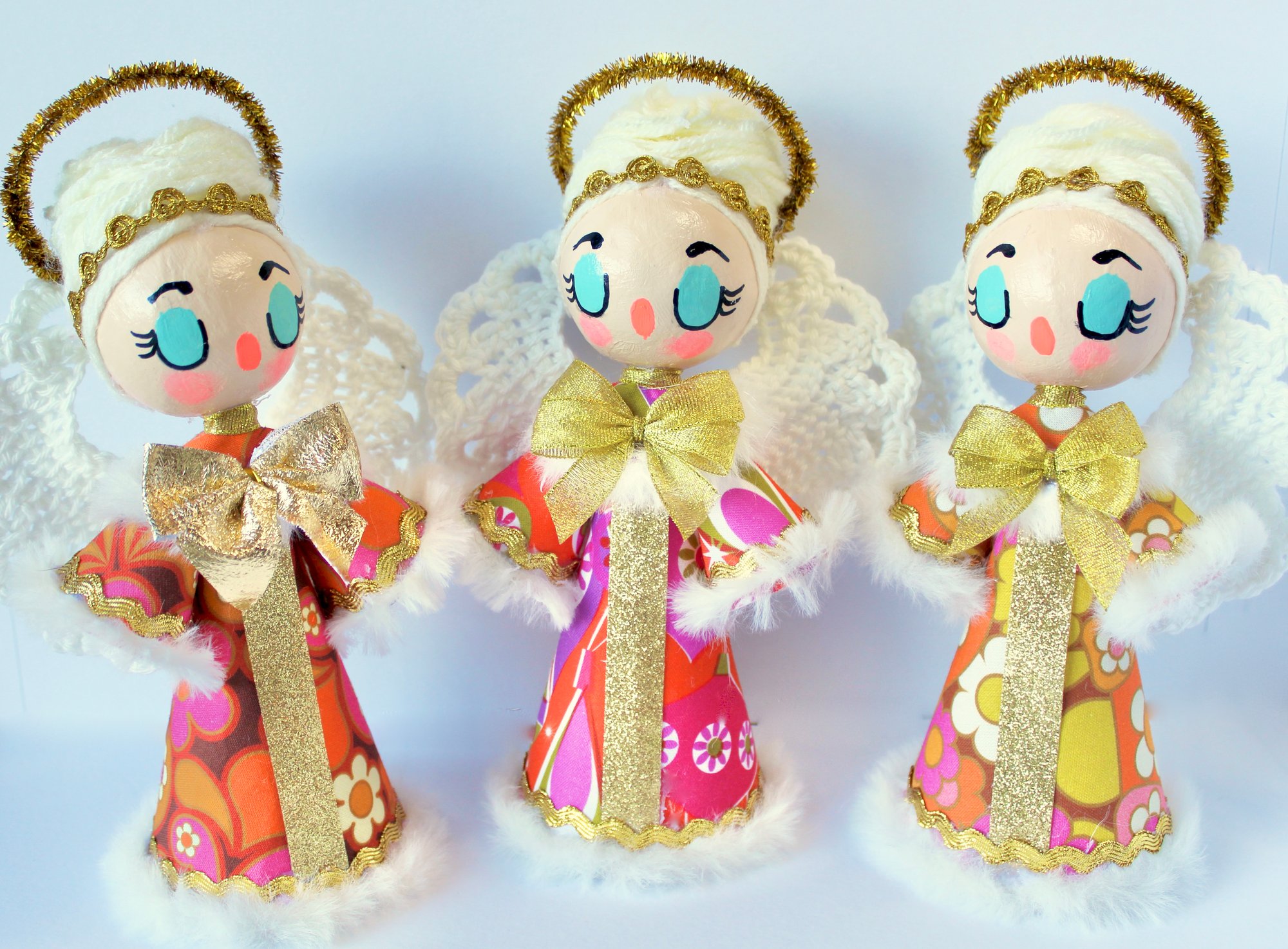 I've handpainted the faces and created their beehive hair with wooly yarn. The wings I have hand crocheted from 100% cotton and added fluffy trimmings, ribbons and lace with extra strong glue.